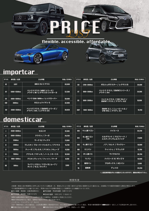 中古車販売 / 保険会社向けに代車を提供しているSun Corporation様の、代車料金表を作成しました。